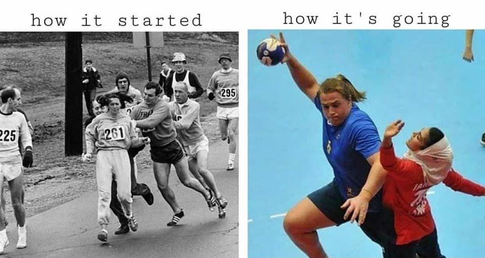 A popular meme theme on social media these days contrasts how something started with how it’s going, often depicting unintended and undesirable consequences. Like the one above with the famous image of the 1967 Boston Marathon official attempting to eject the first woman to run it, juxtaposed with one representing the sad state of women’s sports today being destroyed by transgender ideology.
